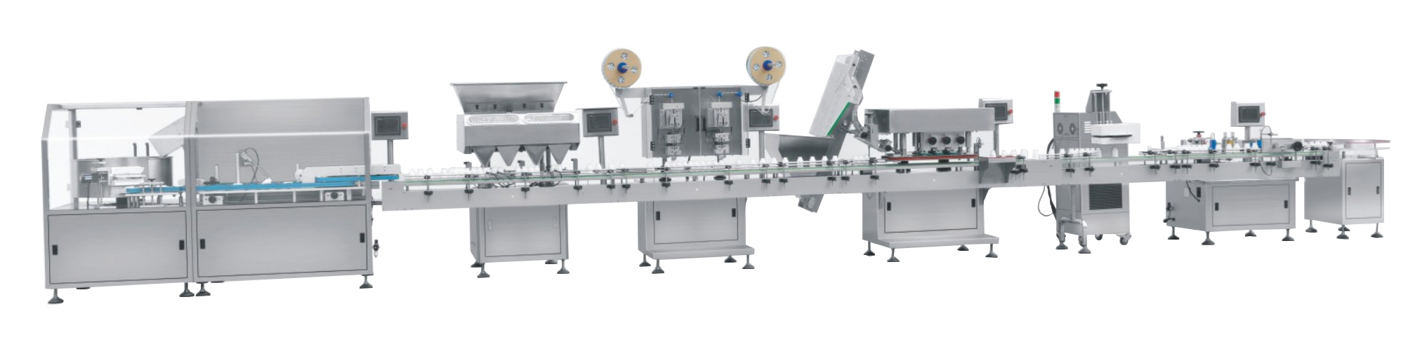 JF-2000-32 Grain counting bottling packaging linkage production line is made up of JF-2000 bottle unscramble,JF32 electronic counting machine,JF-C120 automatic desiccant inserter(cotton inserter or paper inserter),JF-D903 high speed capping screwing machine,JF-M1 water-cooled induction sealer,JF-T1 high speed round bottle side face labler(coding machine).